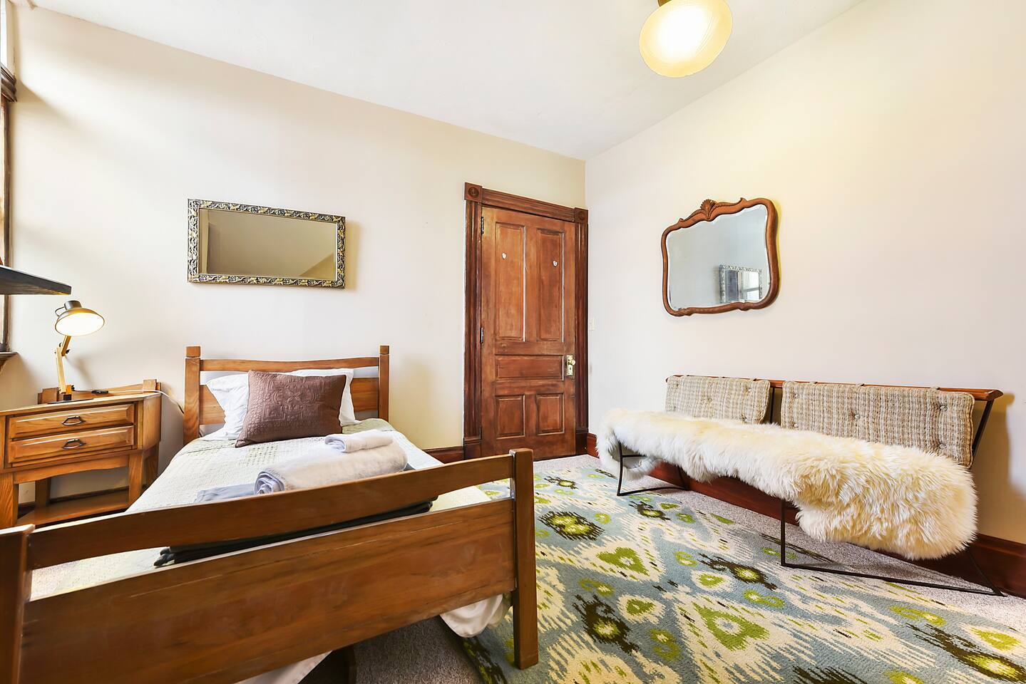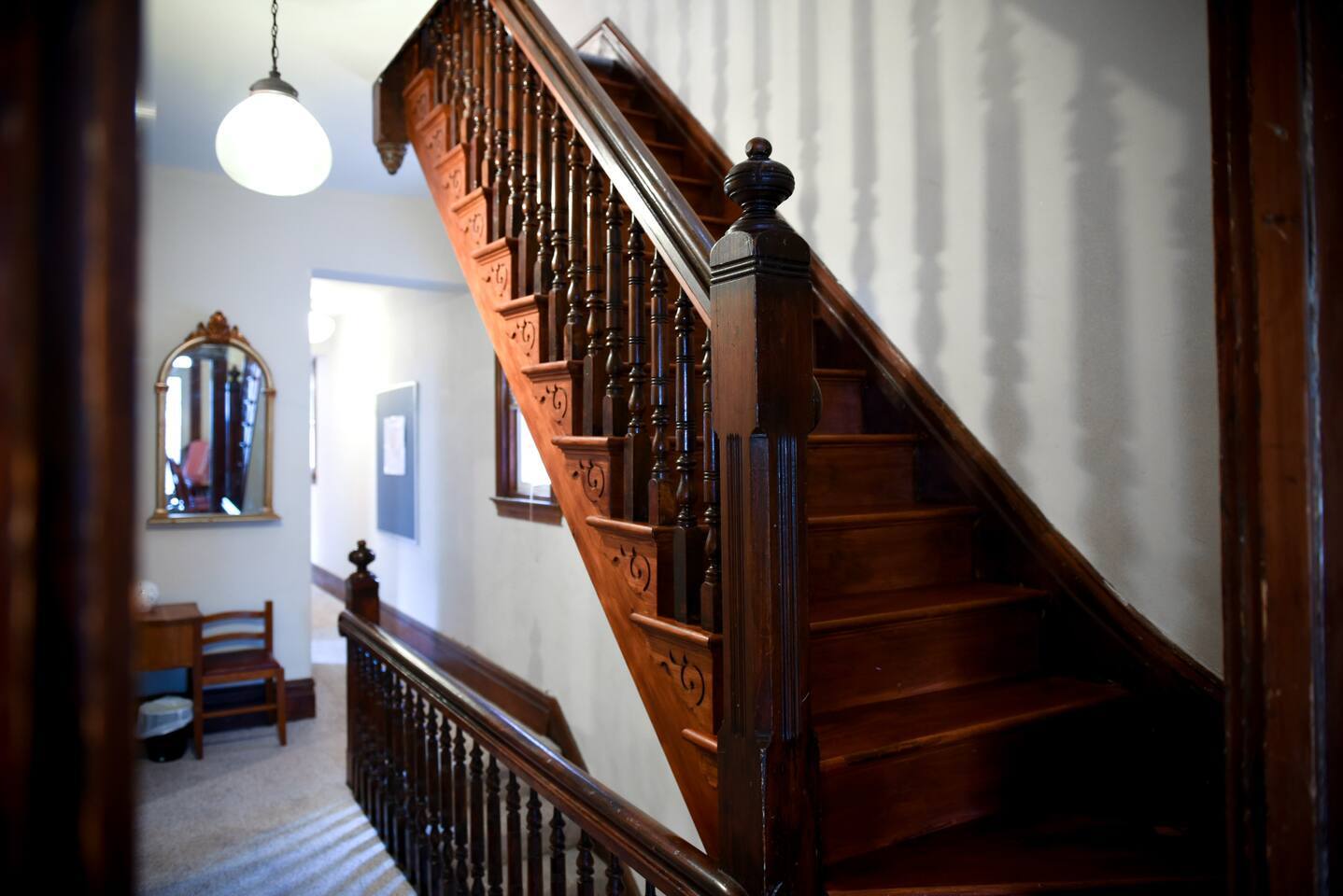 Make your way up the grand front steps and check yourself into this elevated, second-floor apartment rich in history with original features and generous rooms giving everyone their own space to relax and unwind. Gather together in the sun-filled living area where you can sit back on the inviting sofas that surround the ornate, original fireplace and big screen smart TV or pick out one of the many board games on offer for a fun family night in. On a lazy afternoon, pick out a book from the mini library and relax by the gorgeous turret windows or open up the French doors and step out onto the stunning raised patio and watch the world go by. Cook up a decadent breakfast through to a three-course meal within the modern kitchen that comes fully equipped with quality appliances, a coffee/tea station, a fridge/freezer and all the cookware, dinnerware and utensils you could need. Serve up your meals in the formal dining area off the living space, at the kitchen table or treat the group to a night out with many restaurants and cafes just a short walk away along Bryant St. When it comes time to rest, you’ll find four generous bedrooms within the apartment with each offering comfortable beds topped in soft, quality linen along with plenty of space to unpack and make yourself at home. The master suite features beautiful Victorian architecture and is filled with a luxuriously large king bed framed with two leadlight windows. Bedrooms two and three both offer queen beds and handy workspaces while bedroom four is perfect for kids with two twin beds.